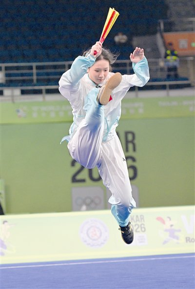 在备受关注的女子A组(15—17岁)太极扇决赛中,中国队选手汪静宜展现出相当高水准。她动作刚柔并济,将太极拳的舒缓与太极扇的灵动完美融合,扇影翻飞间节奏把控精准,难度动作高质量完成,最终以9.260的高分锁定冠军。她作为本届赛事运动员代表,在开幕式上完成宣誓。