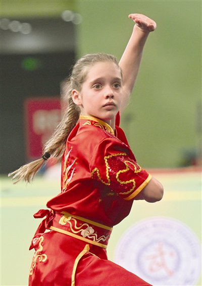 随后进行的女子儿童组(11岁及以下)长拳赛场,中国队小将王艺芮以8.550分的优异成绩夺冠。她的长拳动作规范舒展,弓步、马步扎实稳健,腾空跳跃动作轻盈流畅,整套演练一气呵成,完美展现了儿童组选手的活力与技术功底,为中国队再添一冠。
